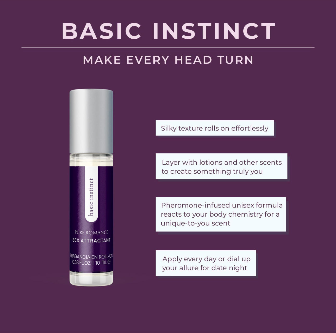 This is Basic Instinct, a Pure Romance top seller. We call it a sex attractant because that’s what it’s all about. This pheromone-infused formula combines with your natural scent to help you feel more daring, sexy, and attractive. Since it reacts to your skin’s pH level, the scent is completely unique to you, not to mention unisex. Roll it on your pulse points and layer it with your favorite lotions or even other fragrances to give your allure a little oomph.