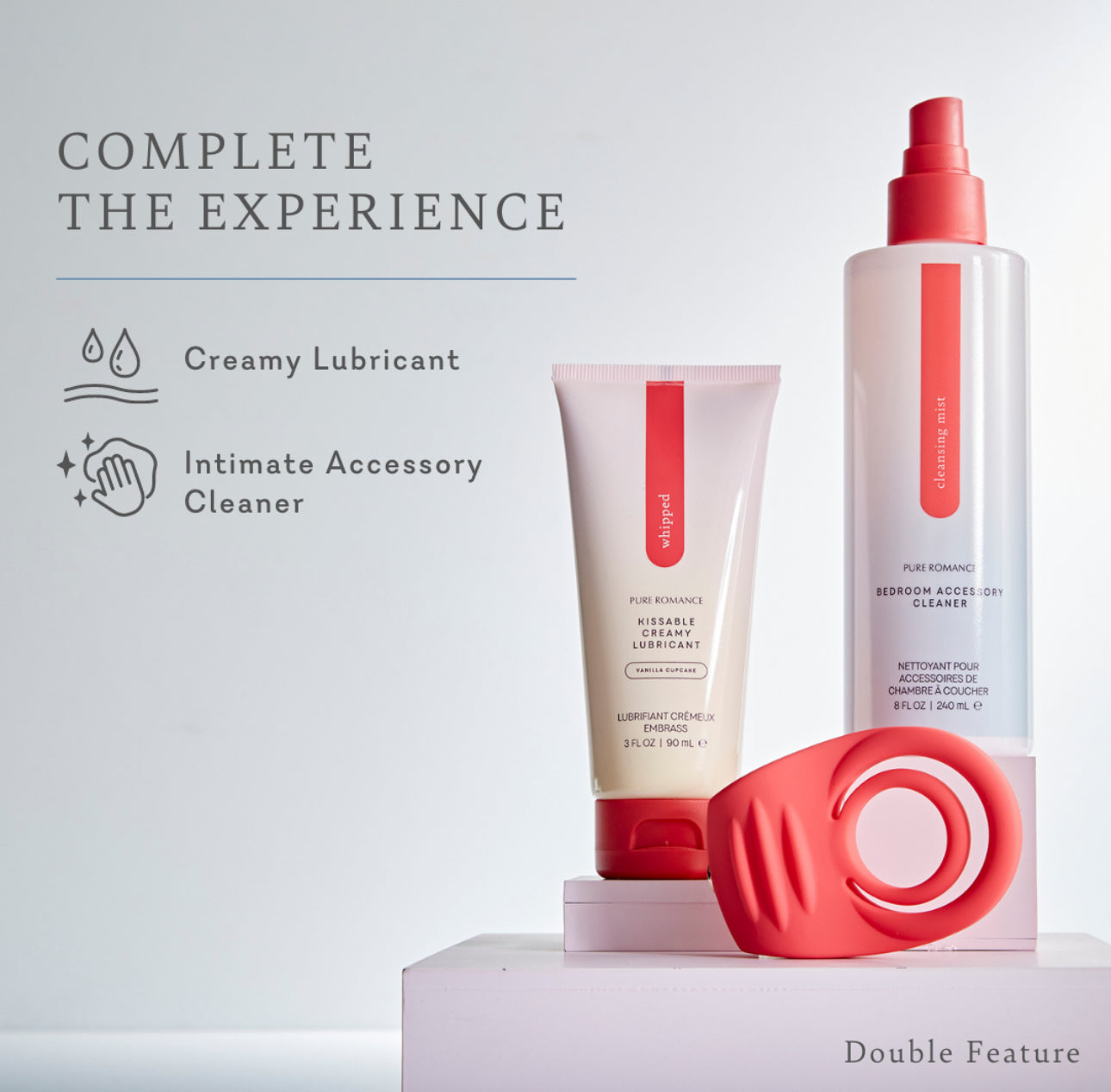 As great as it is to be a star in the bedroom, what about a Double Feature? This is Double Feature, the most popular c-ring we have. Twin rings made from flexible silicone pair perfectly with a textured clitoral vibrator for an unforgettable performance. With seven pulsing patterns and three speeds to choose from, this toy has a quieter motor that lets you focus on the moment. As with all of our c-rings, don’t forget to use this with our Whipped lubricant to help get the c-ring on and in place. This is one Double Feature you won’t want to miss.