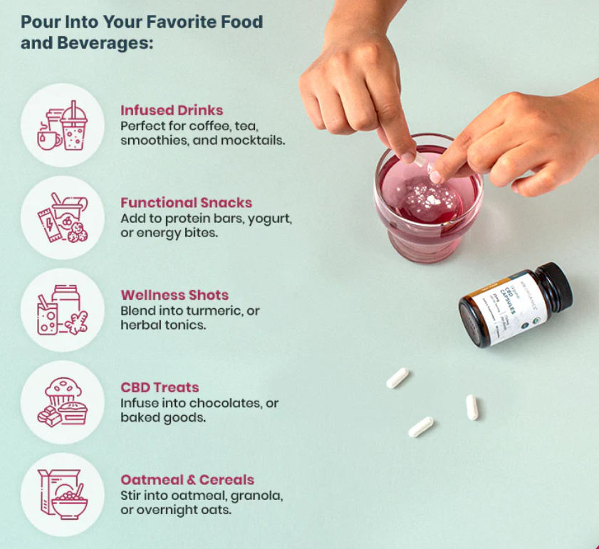 "Wellness, your way." – Take 1 capsule as-is or sprinkle it into your favorite drink for a water-soluble boost of CBD that fits right into your routine.